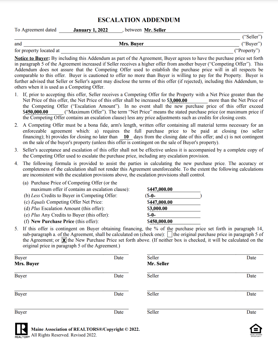 - If the seller receives other offers for the property this addendum escalates your offer to $3,000 higher than theirs (escalation amount). There is also a spot to specify what your maximum offer would be. In this case, the max offer will be $450,000.